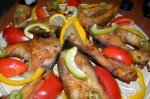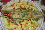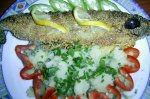 pastravul se curata si se spala , se incresteaza pe spate se aseaza in tava cu usturoiul feliat , cimbru ,sare si piper . se stropeste cu ulei de masline, zeama de lamaie ,si sos de soia . se da la cuptor bine incalzit 30 min , foc iute . se decoreaza cu ardei si...