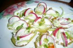 Cartofii se fierb cu coaja in apa cu sare , se curata si se feliaza rondele . Rondelele se ung cu salata de icre si se decoreaza cu ridichi , praz si ardei iute . Tartinele sunt deliciose cat cartofii sunt calzi. Asezonati cu piper proaspat macinat .
