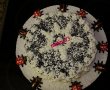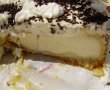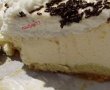 Umplutura se pune peste aluat in tava si se da tava la cuptor pentru 8o de minute am dat eu la 150 grade(rezultattul inca nu il stiu ,pana nu voi taia tortul).Cand e copt se lasa in tava sa se raceasca, apoi se scoate inelul detasabil si se pune la rece 2 ore . Eu in schimb l-am pregatit seara si l-am lasat pana a doua zi la frigider .