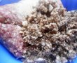 Am pus carnea macinata intr-un castron,am pisat usturoiul si l-am pus peste ea,ciupercile le-am maruntit la blender si le-am adaugat peste carne,menta am tocat-o marunt,la fel si ardeiul iute,am mai adaugat pesmet,sare,boia,sumac,oregano  si cele 2 oua si am amestecat foarte bine aceasta compozitie pentru a o omogeniza.