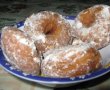 Dupa aceea adaugam faina si amestecam, trebuie sa iasa ca aluatul de gogosi facute cu drojdie. Lasam aluatul sa se odihneasca putin. Dupa aceea formam cu mana cerculete mici pe care le prajim in uleiul incins. Cand sunt gata le pudram cu zahar pudra.