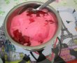 in acest timp se pregateste frisca apoi se amesteca cu crema de oua,siropul,fragutele spalate si pasate dar nu de tot(sa se simta prin inghetata bucatele mici,2picaturi de colorant,se omogenizeaza totul bine,se rastoarna in masina de inghetata care a stat 24hla congelator,se amesteca cateva minute apoi se da din nou la congelator,dupa3h se scoate se mai amesteca in masina apoi se serveste cu dulceata deasupra