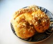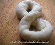 Aluatul se rastoarna pe masa de lucru si se imparte in 12 bucati.Din fiecare bucata de aluat se formeaza cate un cerc,apoi se formeaza cifra 8!