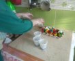 Între timp se pregătește vopseaua: se toarnă fiecare culoare în câte un recipient, se adaugă puțină apă caldă (40-50 ml în fiecare culoare) și câte 2 linguri de oțet. Se omogenizează și se pregătește câte un bețișor în fiecare culoare, pentru vopsire.