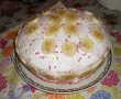 Blatul dupa ce s-a facut il taiem in doua si lasam sa se raceasca,insiropam fiecare parte cu zeama de compot de capsuni,adaugam crema,ornam cu frisca ,banane si bomboane.