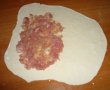 Rupem bucatale de aluat (dstul de mari) si formam mingiute din care intindem o foaie subtire (nici ca foaia de hartie ;) ). Punem umplutura ( in strat foarte subtire, ca sa se patrunda bine) pe jumatate din ea, acoperim cu cealalta jumatate de aluat si taiem marginile astfel incat sa obtinem un semicerc.