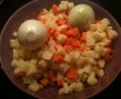 Se pune carnea la fiert, se spumeaza si cand este aproape fiarta se adauga legumele tocate si o lingura de delicat.