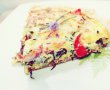 Apoi se tapetază o formă de tartă cu foaie de pergament, se pune foietajul dezghețat. Friptura, cartofii prăjiți, ardeiul kapia, ceapa verde se taie bucățele, apoi se așează artistic pe foaia de foietaj. Ouăle se amestecă energic cu brânza de vaci, cașcaval, asezonate cu nucșoară și piper.
